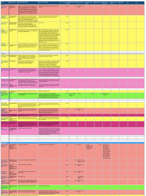 It’s getting pretty massive. There’s a list of agent names down the side, and across the spreadsheet are columns for contact details, agency name, submission guidelines, their wishlist/relevant clients, when I sent a query, if/when they responded and what that response was, if/when I sent further pages, and so on.